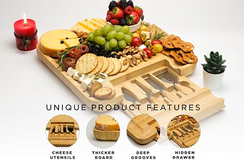 - Elegant Design: Elevate your hosting game with this premium bamboo cheese board and charcuterie set. Our generously sized charcuterie board is crafted to make a bold statement, offering a blend of elegance and functionality that will leave guests talking about your sense of style.