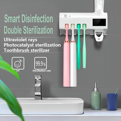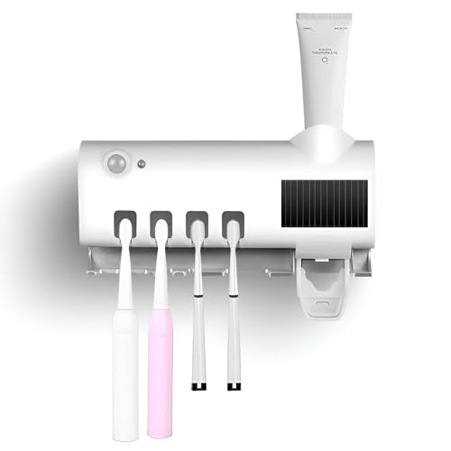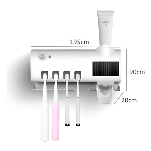 - The multi-purpose storage concept allows this UV sterilizer to hold up to four toothbrushes along with additional compartments for toothpaste, dental floss, and mouthwash, keeping your bathroom organized. Measuring 7.68 x 4.92 x 1.85 inches, it is compact yet highly functional, perfect for maintaining cleanliness while preventing toothpaste wastage.