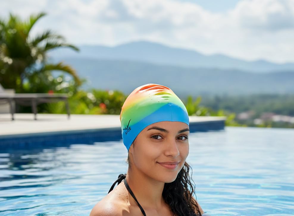 - Silicone swim cap in Green-White and white with clean design Soft material reduces head pressure Improves swimming flow and comfort Suitable for recreational and training use Easy to clean and maintain