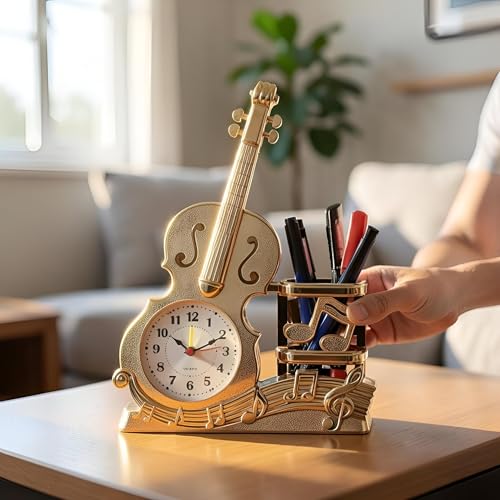 - This unique decorative clock doubles as a realistic violin-shaped pen holder, seamlessly blending artistic design with practical functionality to elevate any workspace, shelf, or living area with a musical and creative flair.