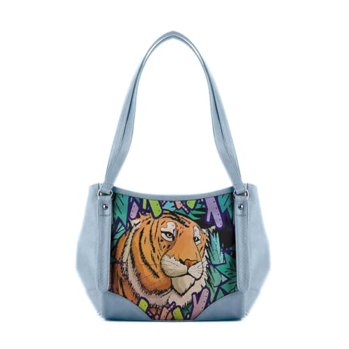 Generic - Designer Leather Tote Bag, Tiger Jungle Print, Light Blue Shoulder Straps