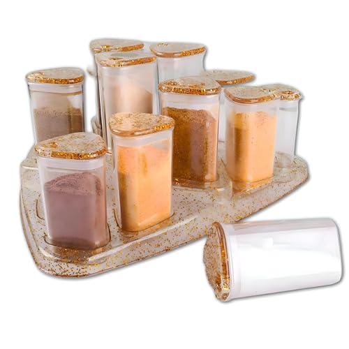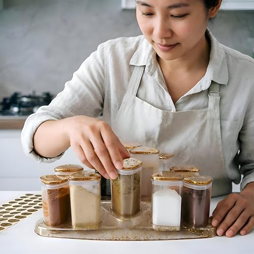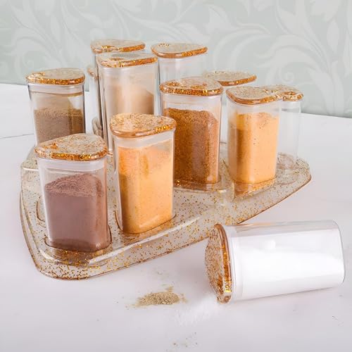 - This 15-piece spice set includes a matching gold-trimmed display tray that elegantly organizes all containers in one cohesive unit, enhancing both accessibility and visual appeal in your kitchen space.