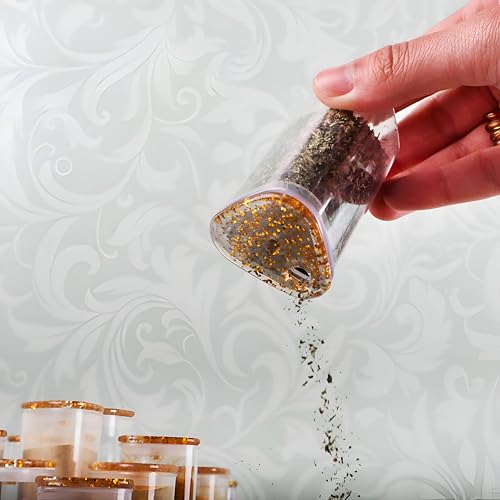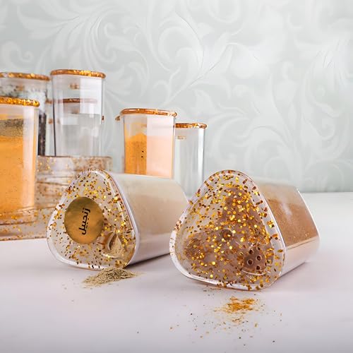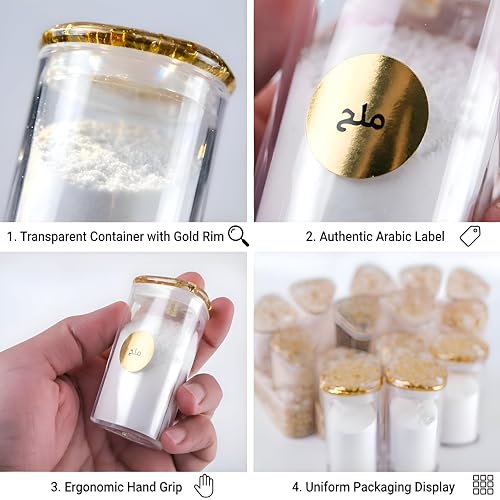 - The set includes complimentary pre-printed gold-toned adhesive labels featuring common spice names in Arabic script, enabling effortless identification and organization for Arabic-speaking households without the need for manual labeling.