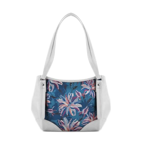 Generic - شنطة يد كبيرة توت من الجلد مصممة من الجلد الأبيض بنقشة زهور زرقاء، تصميم (سي ليف)