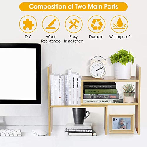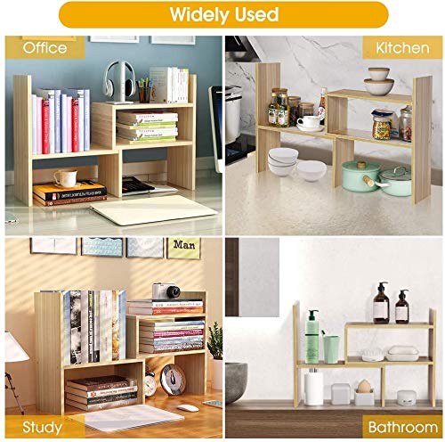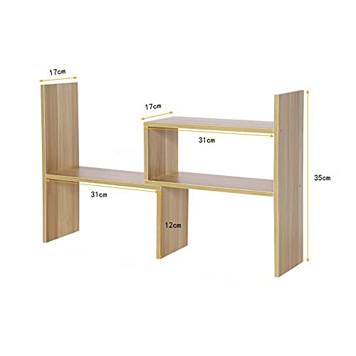 Greensen - Desktop Organiser Shelf Wooden Desk Organiser Shelf Adjustable Desk Tidy Compact Bookshelf Freestranding Countertop Display Shelf Expandable Bookcase for Home and Office Use (Natural Light Walnut)