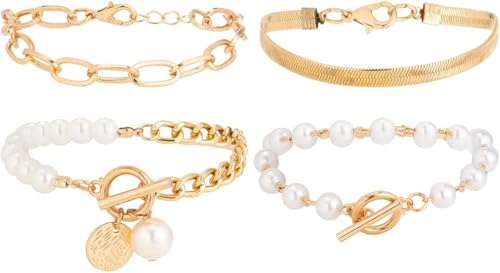 Generic - سوار مطلي بالذهب عيار 14 قيراط للنساء من دي اف مكون من 4 قطع، سوار سلسلة ذهبي قابل للتعديل من الستانلس ستيل للنساء والفتيات