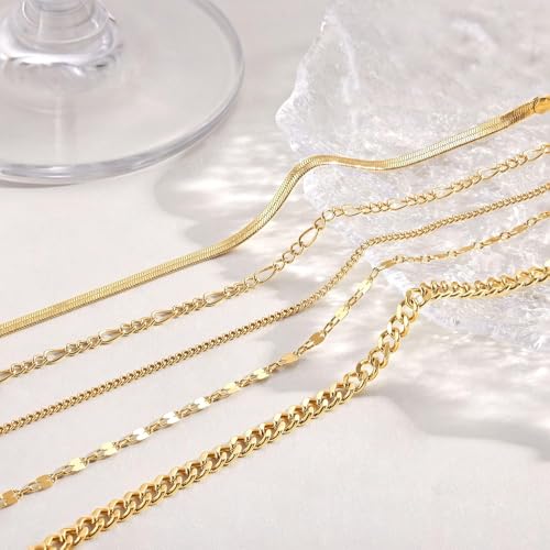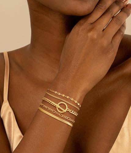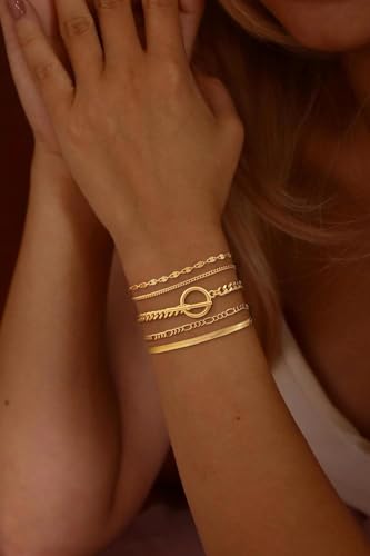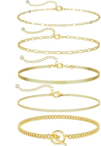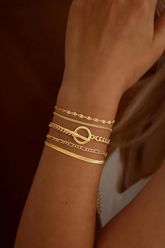 Generic - (DF)5PCS Gold Bracelets for Women Trendy, 14K Dainty Gold Plated Jewelry Sets for Women Waterproof Stackable Cuban Link Toggle Clasp Figaro Chain Bracelets Stack Fashion Accessories, 8 inch, Yellow