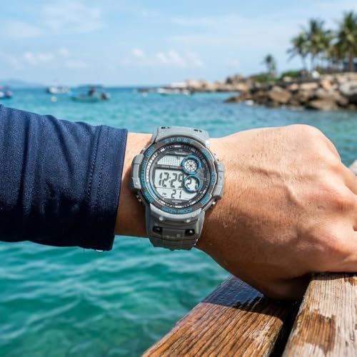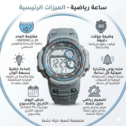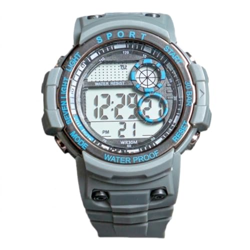 Generic - ساعة رياضية رقمية للرجال مقاومة للماء بسوار راتنج رمادي مع منبه وتقويم وإضاءة خلفية للأنشطة الخارجية والسباحة - DF1717-GRY
