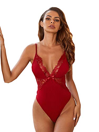 DIDK - DIDK Women's One Piece Lace Deep V Neck Spaghetti Strap Lingerie Teddy Bodysuit, Burgundy, M