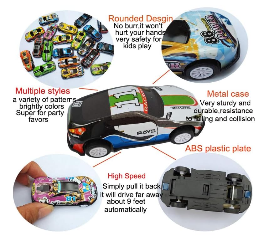 - Skill development: bright colors attract kids' attention, and 12 different shapes help them learn about the kind of racing cars. Wide imagination: encourages children to role play and play with friends, developing imagination and communication skills.
