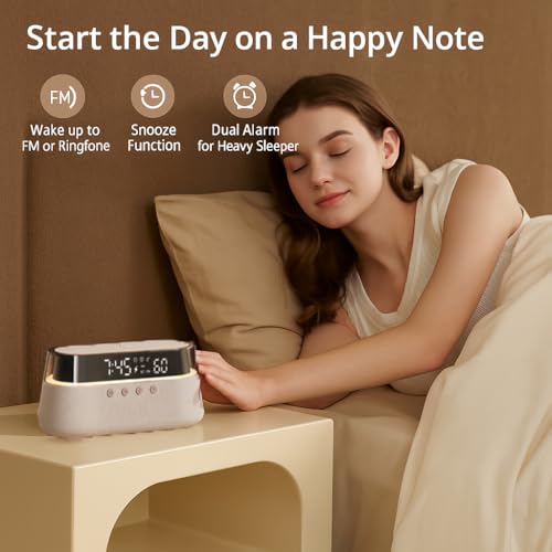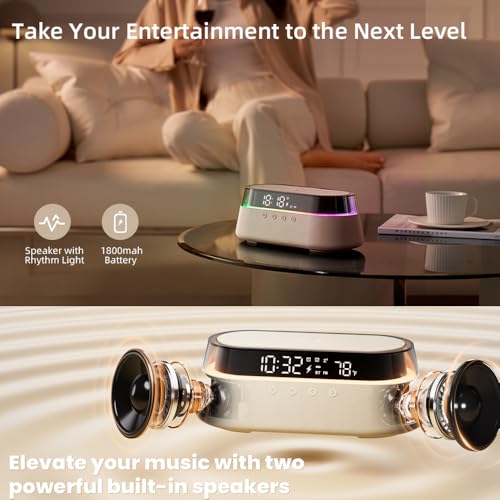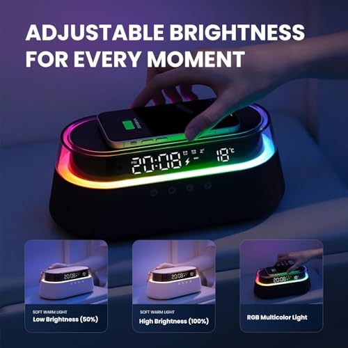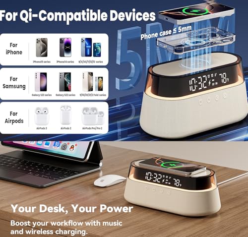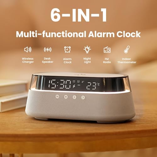 - ⏰【All-in-One Smart Clock】This 6-in-1 alarm clock combines wireless charging, Bluetooth speaker, night light, digital time, FM radio, and thermometer. It auto-syncs time with your device—just plug it in and wait a few minutes for full function. Ideal for simplifying your nightstand or desk setup.