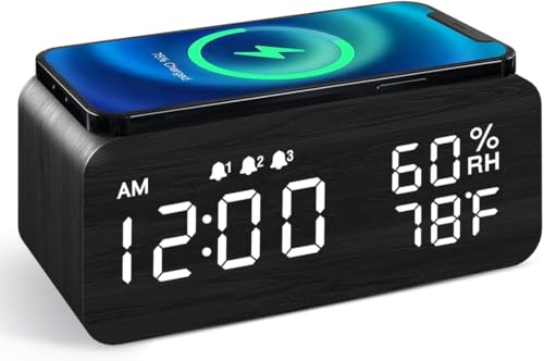 Generic - Digital Alarm Clock with Wireless Charging, LED Display, Temperature and Humidity Monitor, Black
