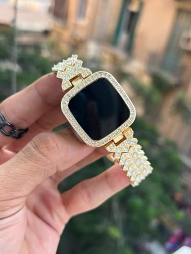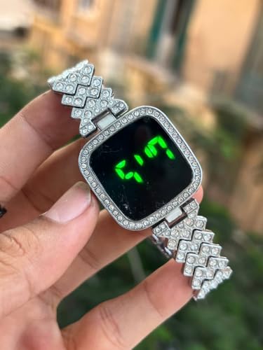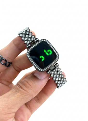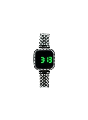 Generic - Digital LED Watch with Rhinestone Crystal Bezel, Black Metal Band, Square Face Display, Green Numbers