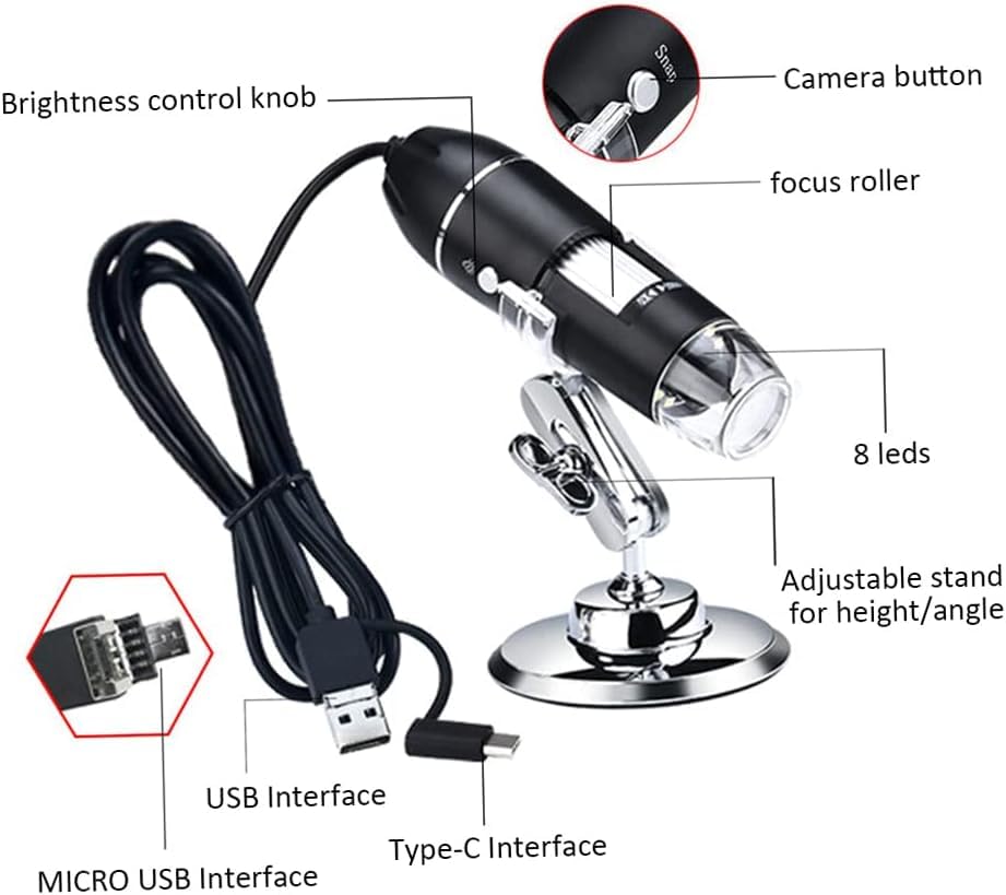- Connect this microscope to your device and you can see images of the microscopic world on your PC or phone screen. Support photo and video functions.