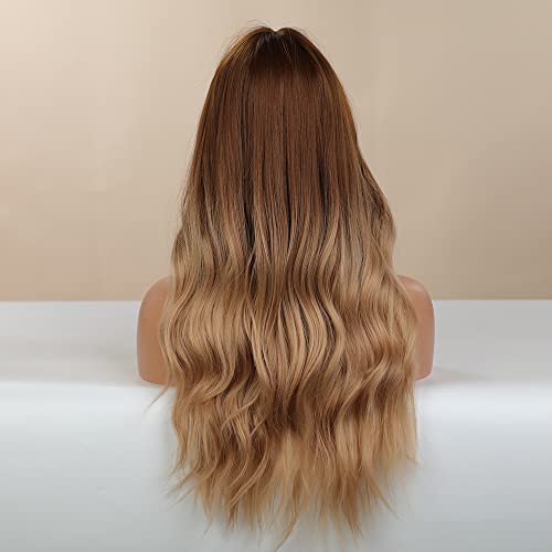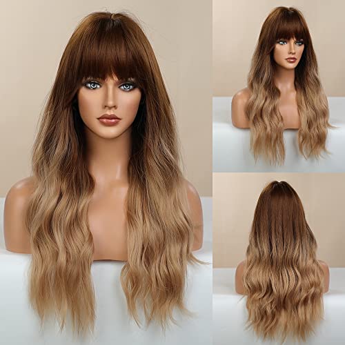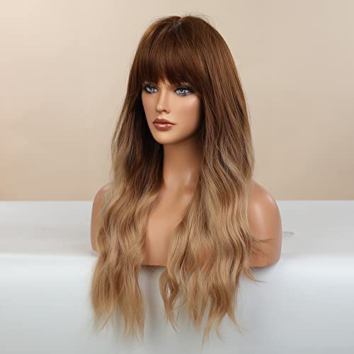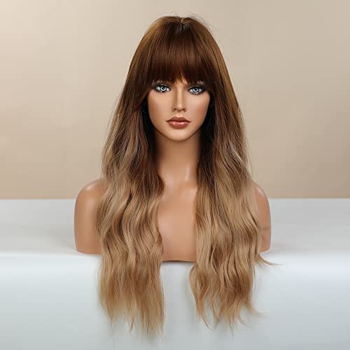 DILLARDS - ديلاردز شعر مستعار اشقر مع غرة من بويور، شعر مستعار طويل مموج اشقر متدرج للنساء، شعر مستعار صناعي بمظهر طبيعي مقاوم للحرارة للاستخدام اليومي والحفلات التنكرية 24 انش