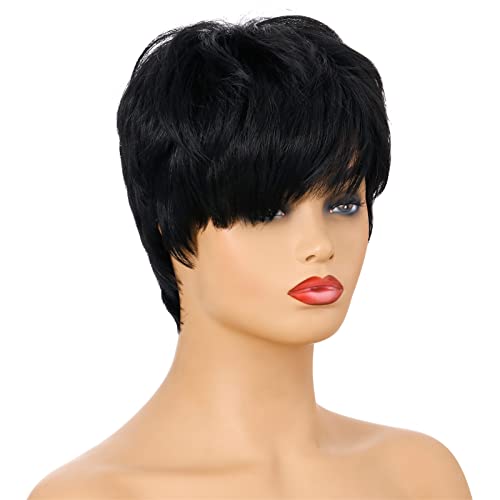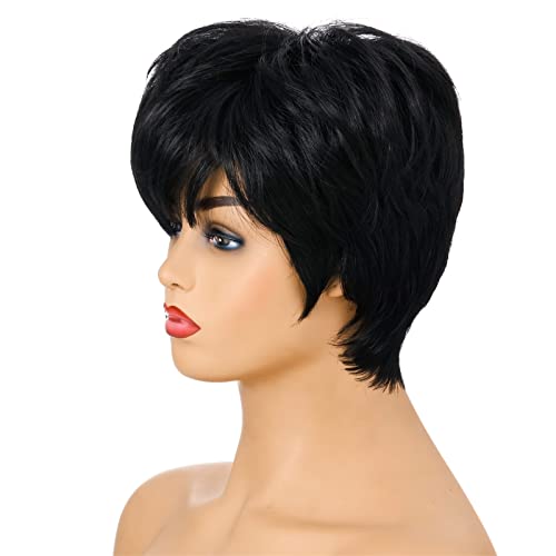 DILLARDS - ديلاردز شعر مستعار صناعي قصير مفرود مع غرة للنساء والفتيات من اف زد ال، لون اسود