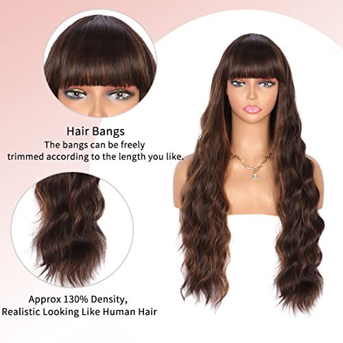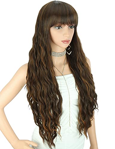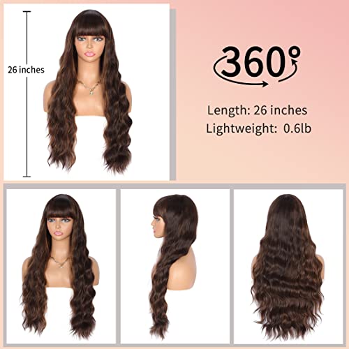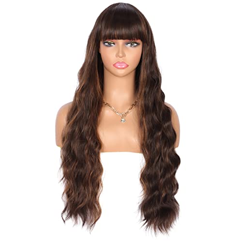 DILLARDS - DILLARDS Kalyss 26 Inches Curly Wavy Synthetic Brown Highlights Wigs With Hair Bangs Heat Resistant Synthetic Wigs For Women Natural Looking Women's Brown Full Wigs