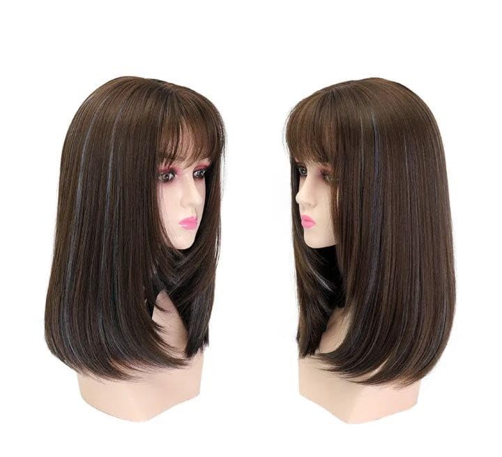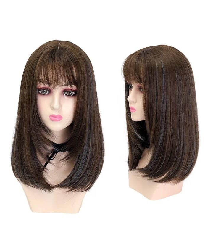 DILLARDS - باروكة شعر رائعة بطول الكتف، شعر صناعي مستقيم باللون البني الغامق مع غرة (قصة)، قصة متدرجة ذات مظهر طبيعي، فايبر مقاوم للحرارة للاستخدام اليومي ولأزياء التنكر من ديلاردز