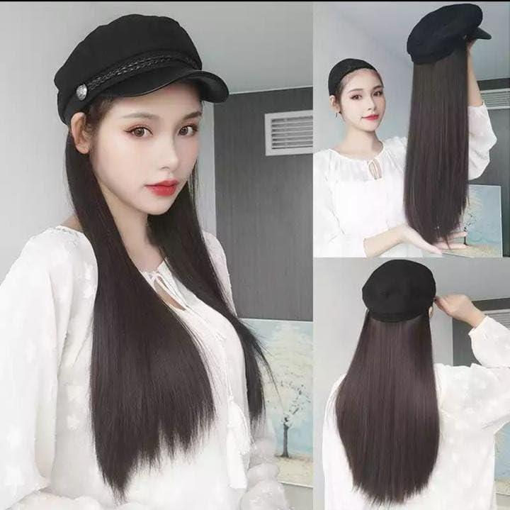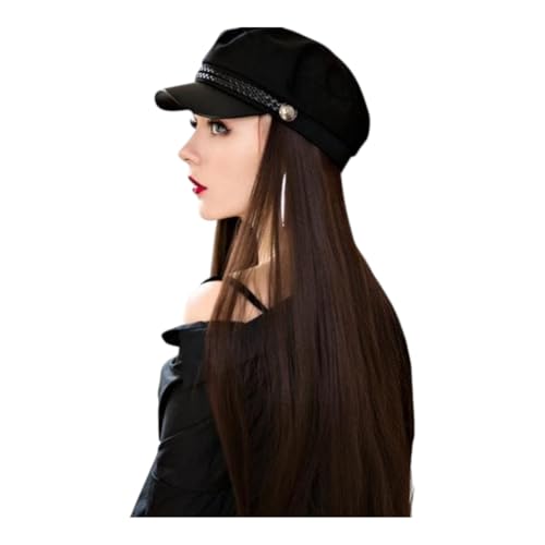 - PREMIUM DESIGN: Long straight black synthetic wig with natural-looking texture, paired with a classic black cotton newsboy cap featuring braided trim detail