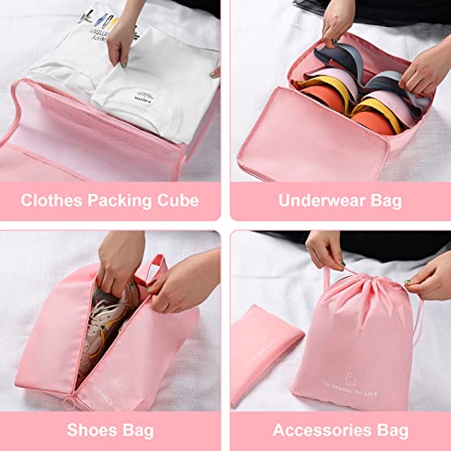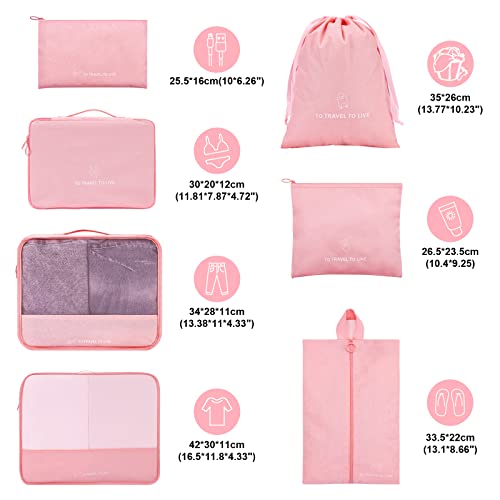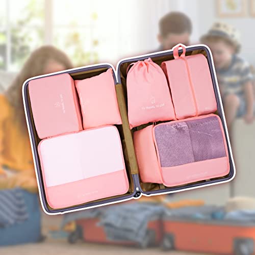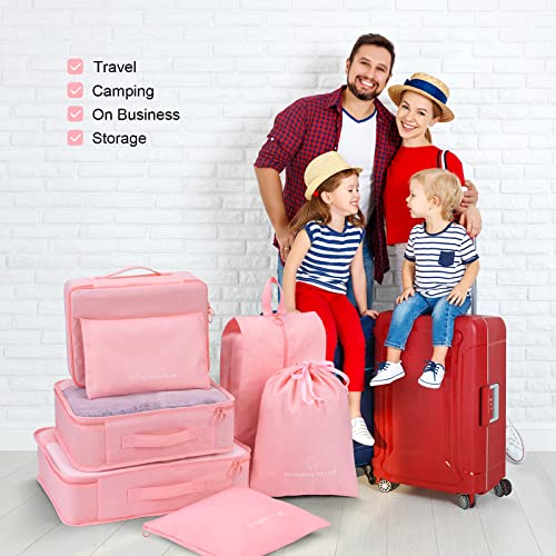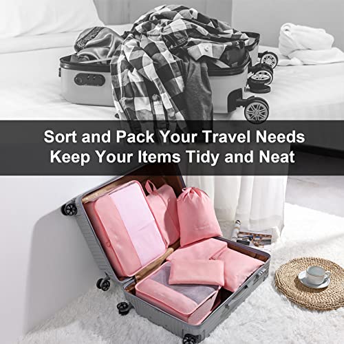 DIMJ - مكعبات تعبئة للسفر، 7 قطع من شنط تنظيم الامتعة خفيفة الوزن مع احجام متعددة، مجموعة مكعبات سفر للملابس والاحذية ومستحضرات التجميل (بينك)، شفاف