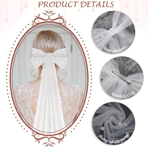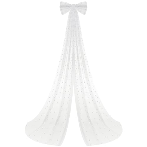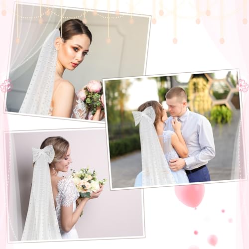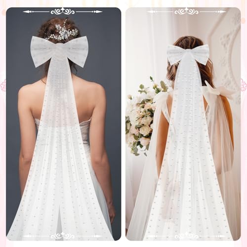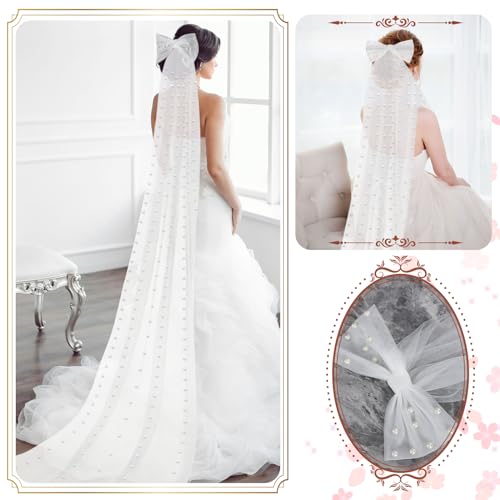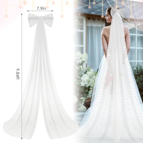 Dingion - Dingion 1 Tier Cathedral Bride Wedding Veil Long Bow Knot Pearl Veils White Tulle Hair Clip Bride Hair Accessories for Women Wedding Bridal Shower Bachelorette Party Decorations, 9.84 ft, White, 9.84