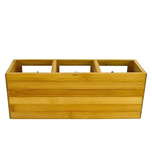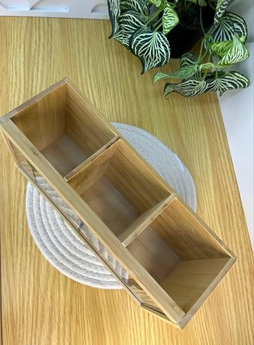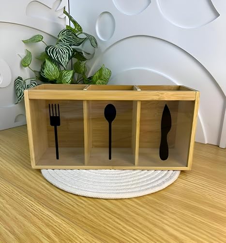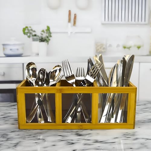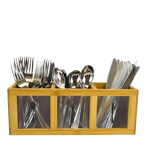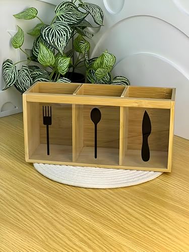 - مصنوع من خشب الخيزران المعالج، حامل أدوات المائدة هذا ليس جذابًا بصريًا فحسب، بل أيضًا مقاوم للماء، مما يضمن المتانة وطول العمر. يمكنك الوثوق في أنها ستحافظ على جودتها حتى في بيئة المطبخ الصاخبة.
