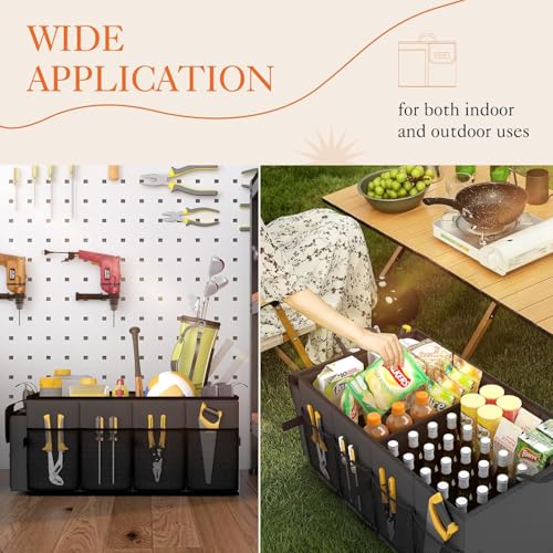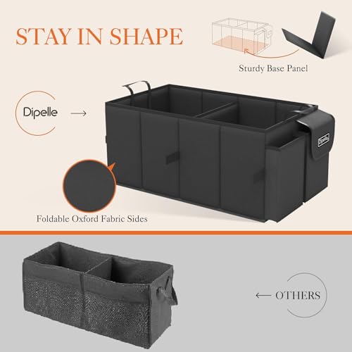 - ✅ Adjustable, Foldable Design to Fit Any Trunk Need to save space? The Dipelle Organizer folds down easily when not in use or can be adjusted to a half-size with strong velcro straps. It fits perfectly in cars, SUVs, sedans, and even trucks, adapting to your needs on the go.