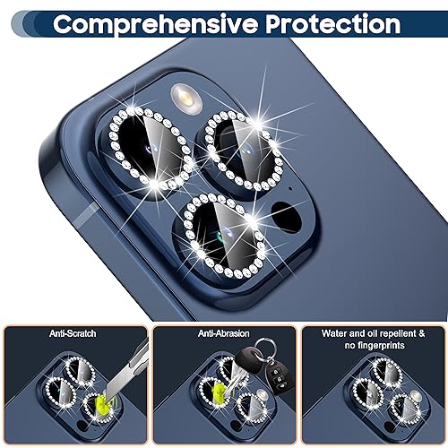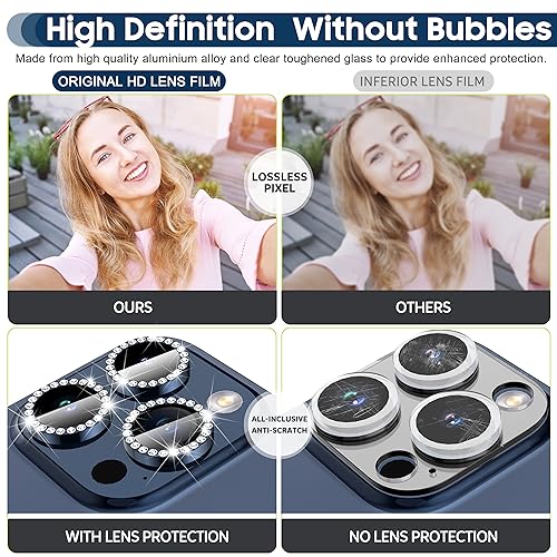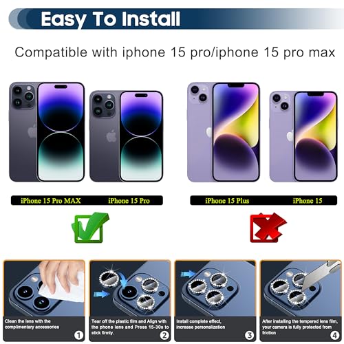- ✨ Sparkling diamond decoration: the camera lens protective film for iPhone 15 Pro/15 Pro Max lens film is decorated with sparkling diamonds, paired with high-quality rings made of aluminium alloy steel. The exquisite diamond pattern creates charming reflections and incomparable shine and creates a super sparkling effect of sparkling diamonds in any light.