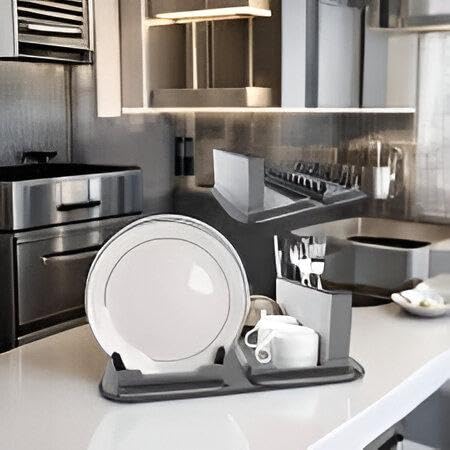 - يتميز رف الأطباق هذا بنظام تصريف شامل، حيث يمنع تراكم المياه من خلال السماح بتصريفها مباشرة في حصيرة الألياف الدقيقة عالية الامتصاص الموجودة بالأسفل. يحافظ هذا التصميم المبتكر على سطح مطبخك جافًا ونظيفًا، مما يزيل متاعب التعامل مع المياه الزائدة.