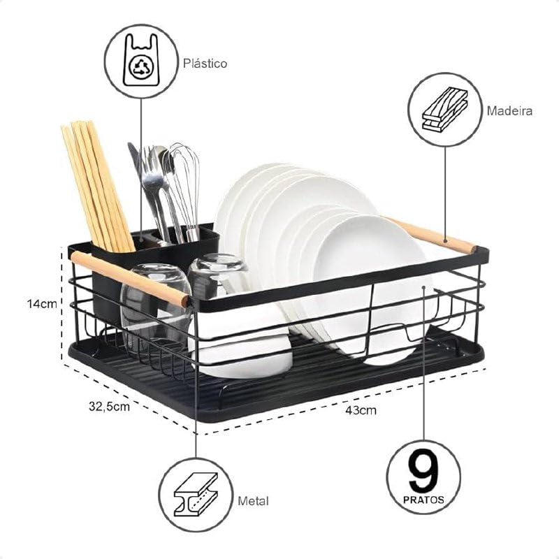 Generic - رف تجفيف الاطباق مع لوح تصريف، هيكل من المعدن والبلاستيك، 43 × 32.5 × 14 سم، سعة 9 اطباق - اسود