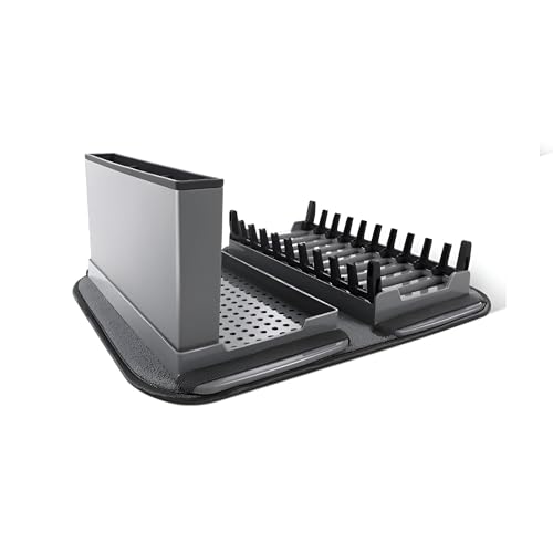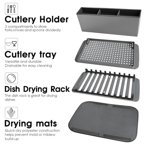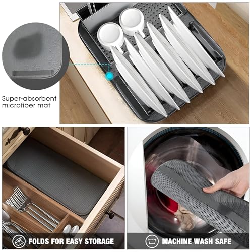 - The dish rack includes a strong microfiber mat that effectively absorbs excess water. These mats are easily washable and stored, ensuring your drying area stays healthy and tidy. Shelf and mat set provides a complete dish dryer solution.
