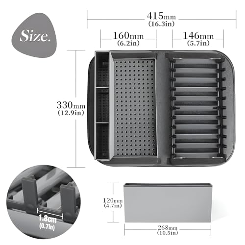 - Specifications include a 16.5" x 13" base (LxW) and a 10.5" x 4.5" measuring tool holder (LxH). Made from durable plastic, this dish rack is designed to withstand daily use while saving ample room for all your dish-drying needs.