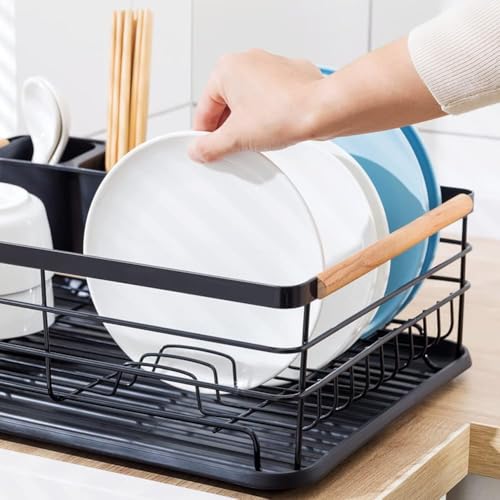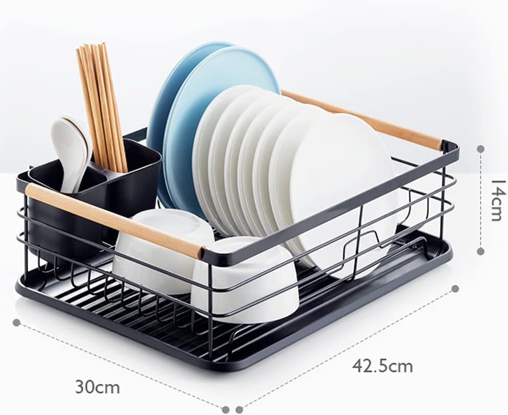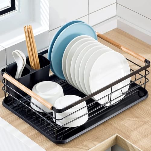 Generic - Dish Rack,Plate Rack, Dish Drainer Rack with Removable Drip Tray, Metal Kitchen Drying Rack Organiser with Wooden Handles, (Black)