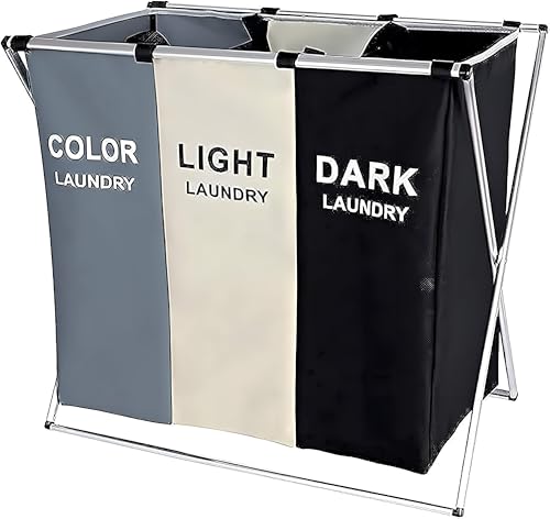 - This laundry hamper is divided into three compartments in black, white, and gray, with a total capacity of 137 liters and a width of 15 inches, clearly wider than typical models that run about 12 inches; the three sections allow large-scale sorting of clothes by type or washing cycle, and each compartment can hold two or more ordinary laundry loads, giving you a structured space to separate whites, colors, and delicates and to plan washes efficiently.
