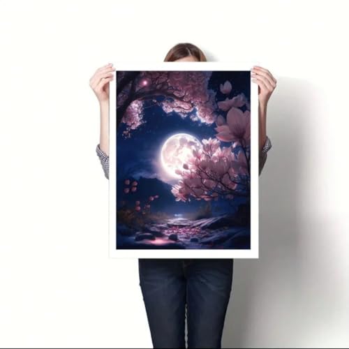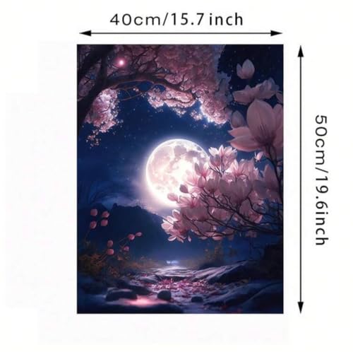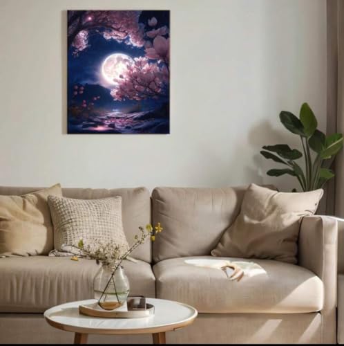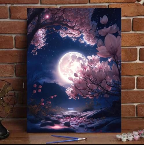 Generic - مجموعة الرسم حسب الارقام، مشهد ضوء القمر على شكل زهرة الكرز، قماش 40 × 50 سم، مجموعة كاملة مع فرش وطلاء اكريليك، مشروع رسم للبالغين