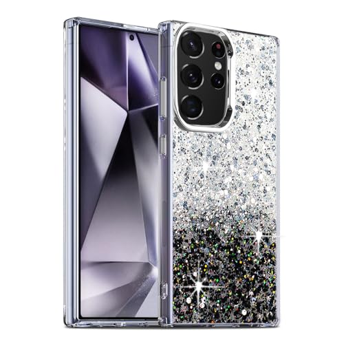 Dl3 Mobilak - جراب حماية شفاف ولامع مزين بالجليتر مع إطار من البولي يوريثين المقاوم للحرارة الناعم، جراب خلفي متين للنساء متوافق مع موبايل سامسونج جالاكسي S23 ألترا من دلع موبايلك (لون أبيض وأسود)