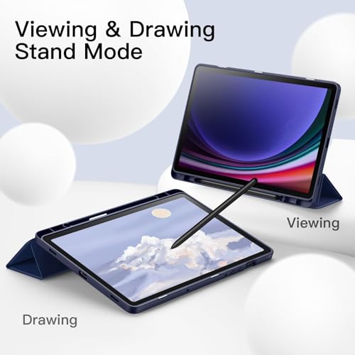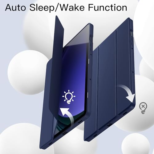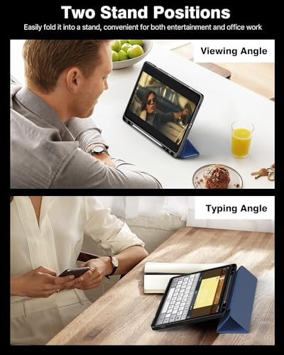 - 💡 جراب متين ثلاثي الطيات: مع الغطاء الأمامي ثلاثي الطي، يمكن استخدام الجراب كحامل لمشاهدة مقاطع الفيديو أو مسند لاستخدام لوحة المفاتيح. اجعل حياتك أكثر راحة بفضل ميزة عدم استخدام اليدين.