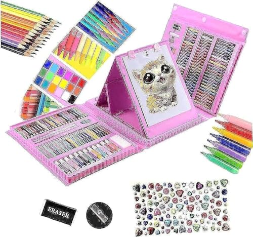 GHAZAL - مجموعة أدوات فنية للرسم دلوكي مع حامل ثلاثي الطيات مزدوج الجوانب ألوان زيت باستيل والوان شمع وألوان خشب مائية و2 كتب تلوين 210 قطعة للأطفال والبالغين وهدية للبنات والأولاد