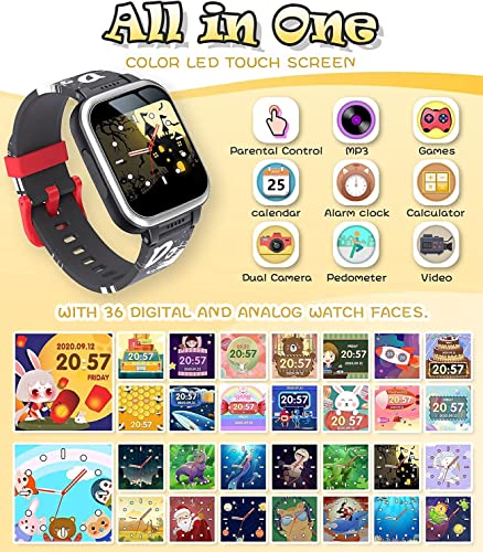 - 【Multi-functional smart watch】Fashionable, child-friendly design, multi-functional kids smart watches contains 17 rich functions, including video recording, photo album, video player, recording, pedometer, music player, 6 games, Study time, 36 dials, alarm clock, countdown, stopwatch, flashlight, calculator, calendar, set wallpaper. This will be a good educational electronic toy for children. Enjoy music and lead a happy childhood.