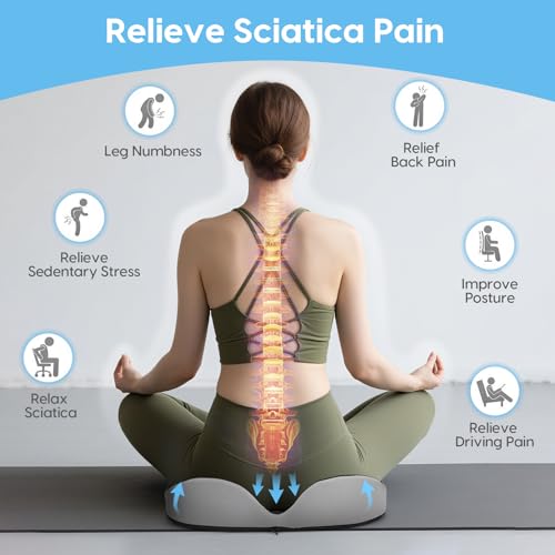 - 【Relieve Sciatica Pain & Posture Improvement】Prolonged sitting easily causes coccyx compression and sciatic nerve pressure even hemorrhoids. Our cushion can directly avoid the coccyx contact surface, disperse the hip pressure and avoid the pain caused by local compression. Specifically designed to relieve sciatica pain, back pain, and leg numbness while reducing sedentary stress. The hip support area and shaping curve also help improve posture and alleviate coccyx pressure.