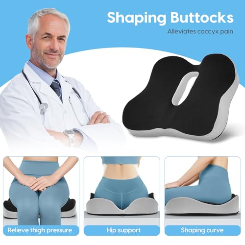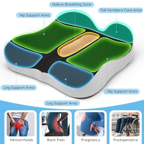 - 【Ergonomic Design】This coccyx cushion for tailbone pain is crafted with 4 ergonomic designs. The hollow breathing zone and tailored support areas (hip, leg, and tail vertebra) ensure ergonomic comfort. The contoured shape fits the pelvis for support and effectively soothes soreness, making it ideal for prolonged sitting.