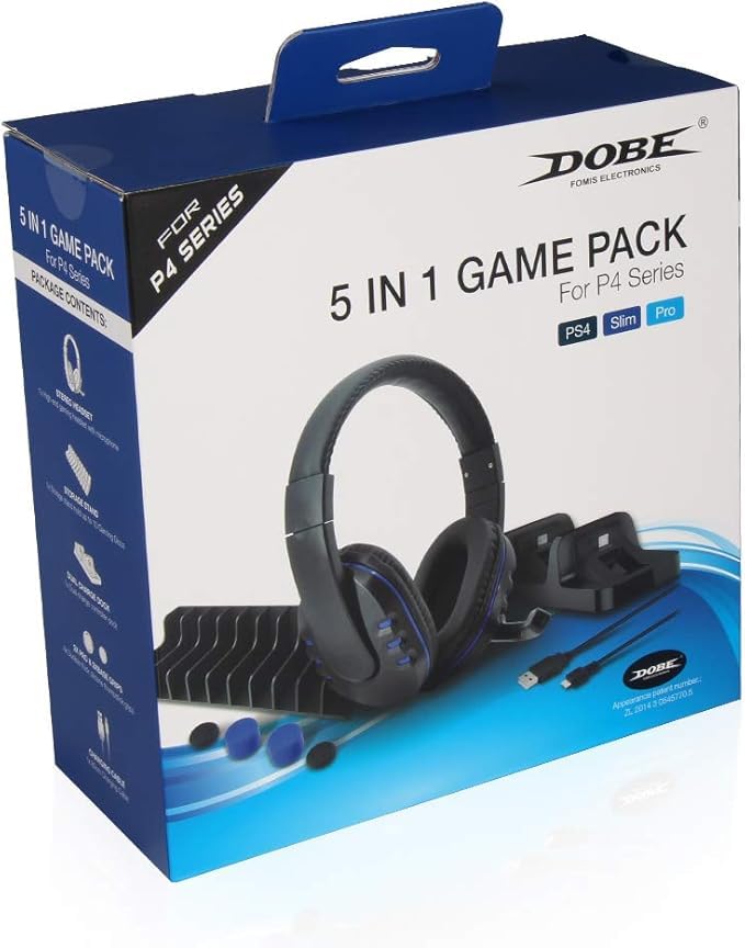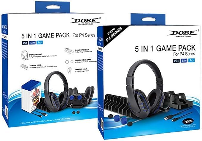 - Dobe 5 in 1 Game Pack, Dual Charger Station Dock, Headset with Mic, Disc Stroage Stand, Charging Cable and Thumbstick Cover Grips for Playstation 4 PS4, PS4 Pro, PS4 Slim
