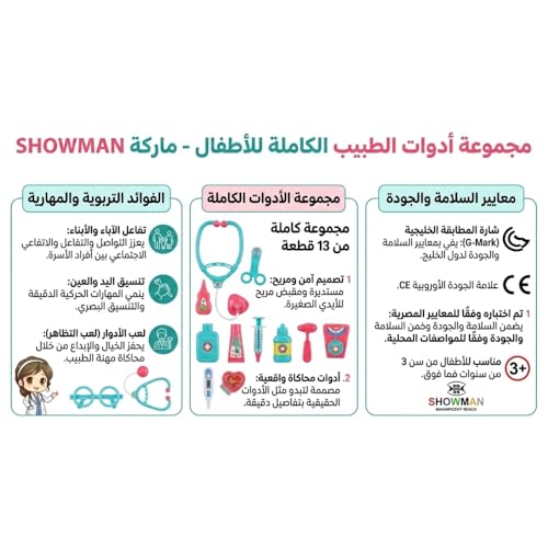 - مجموعة متكاملة من 13 قطعة: تشمل سماعة طبية، محقنة، مقص، ميزان حرارة، نظارة، مطرقة، وأدوات طبية أخرى