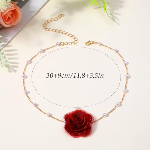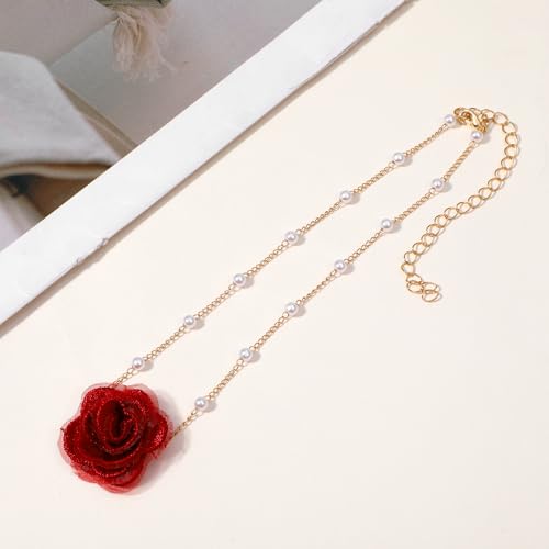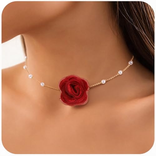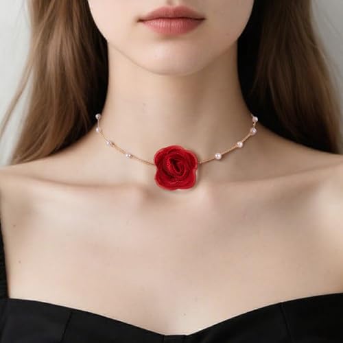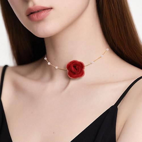 DOPENSPI - عقد طوق ضيق بتصميم زهور عتيق للنساء، عقد وردة مع لؤلؤ صناعي صناعة يدوية وقابل للتعديل، عقد للحفلات والمناسبات من دوبينسبي، لون أحمر