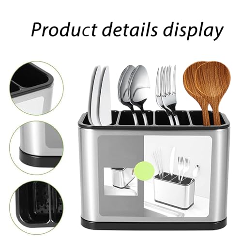 - Our stainless steel utensil holder is a detachable tray. Our cutlery holder has small drainage holes at the base of every compartment to keeps the water dripping down, and the discharged water droplets will gather in the detachable tray below.This not only allows the cutlery to dry quickly, but also keeps the kitchen countertop and drawer clean and dry.