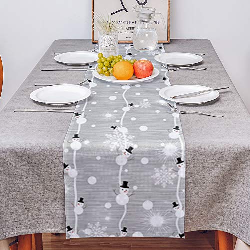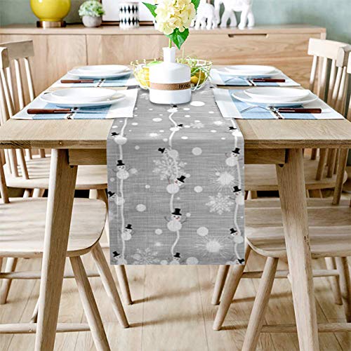 DoremiHome - مفرش طاولة من الخيش الكتاني لتزيين طاولة الطعام للاستخدام اليومي بعبارة Merry Christmas، اغطية مائدة مقاس 13 × 70 بوصة لحفلات العشاء والمناسبات، نمط رجل ثلج للكريسماس بلون رمادي وابيض