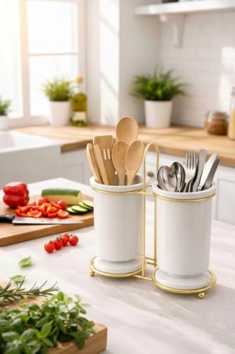 AREXOL - Double Ceramic Spoon Fork Holder Kitchen Utensils Wooden Partition Interior Organizer Countertop Sink Tidy