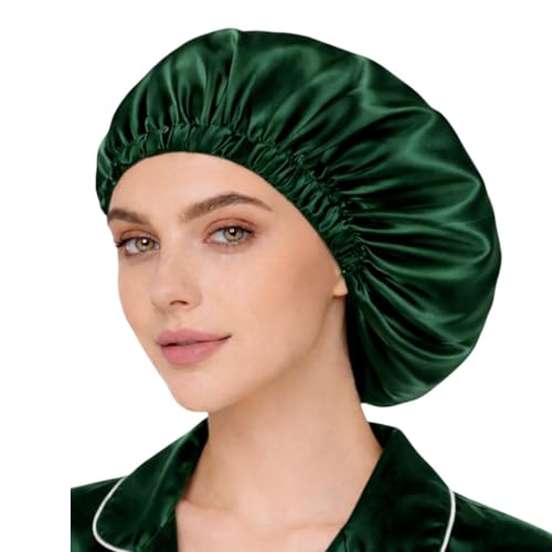 Generic - Double Layer Silk Satin Bonnet Reversible Bonnet Comfortable Elastic Headache Free Premium Quality Bonnet with Scrunchie Gift (Black+Dark Green)