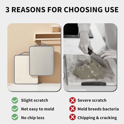 - 🥔【سهل التنظيف】كلا الجانبين غير لاصقين. امسح اللوح بالماء والصابون، أو ضعه في غسالة الأطباق لتنظيف شامل، يرجى تنظيف لوح التقطيع في الوقت المناسب بعد تقطيع اللحم والخضروات لتجنب التلوث المتبادل.