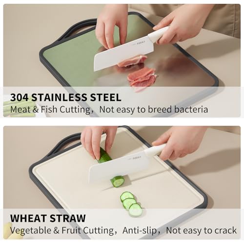 - 🍖【جانب للحوم وجانب للمنتجات الأخرى】يتضمن لوح التقطيع جانب سميك مصنوع من الفولاذ المقاوم للصدأ 304 وجانب آخر مصنوع من البولي بروبيلين وقش القمح، وهي مواد صديقة للبيئة وأمانة للاستخدام. فولاذ مقاوم للصدأ لتقطيع اللحوم النيئة والمطبوخة، والجانب الآخر لتقطيع الخضروات والفواكه حتى تتمكن من تجنب التلوث المتبادل.